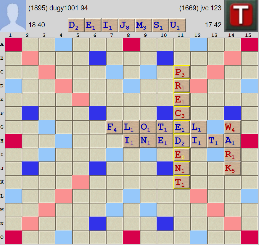 Sam: I probably would have played MUSJID, had I seen it. I vaguely felt there was a word like that available but didn't find it. I liked that JUMPED retained the S with PRECEDENT(S) and other bingo lines available, so I thought the 6-point sacrifice compared to JUPES was worthwhile.