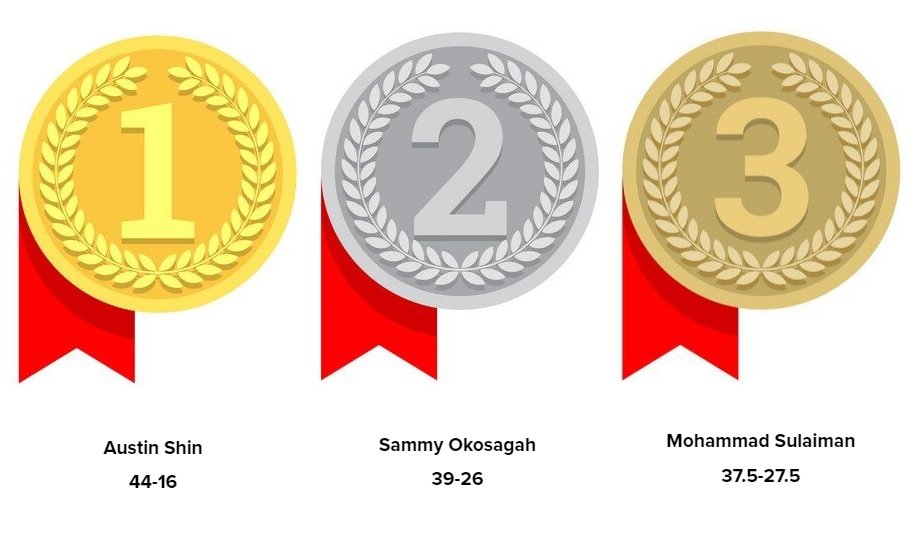Third place for the quarter went to Mohammad Sulaiman, who held off David Eldar's late charge in the final week's session to finish a game ahead in win differential, +10 to +9. This was the second top-three finish for Mohammad this year - he also came in third in the spring quarter.