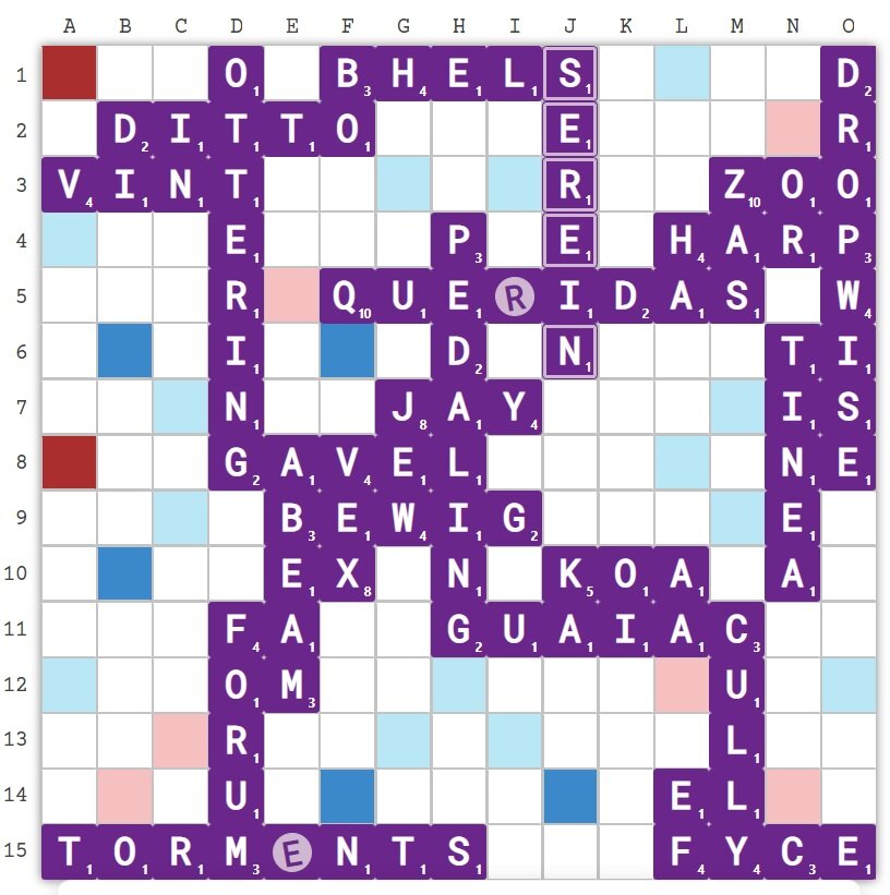 Also, I should mention a key scheduling note regarding future club sessions. We got a lot of feedback that our Tuesday sessions, beginning at 6:30 Pacific time, were too late for many of our East Coast players. In light of this, we're going to change things up - we're now going to start at 7 p.m. Eastern time, 4 p.m. Pacific, and run 10 rounds of Scrabble instead of 5. This means if you're out East and want to start early, you have that option; if you're in the West and prefer playing later, you can do that too. Or, just go crazy and play all 10 games! The choice is yours.