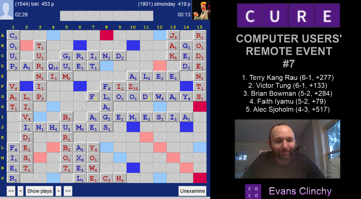 Terry went into the final round of the CURE7 in second place. Both she and Brian Bowman had 5-1 records, with Brian in first place with a larger spread of +318 to Terry’s +243. They were paired in the final round and Terry needed to win to clinch the title. In that final game, Terry found the double-blank bingo of f(L)OOdWAY, impressing the Twitch audience watching from home. (If you missed the live Twitch broadcast, you can still check out the archive of the CURE7 stream with live commentary on our YouTube page.)