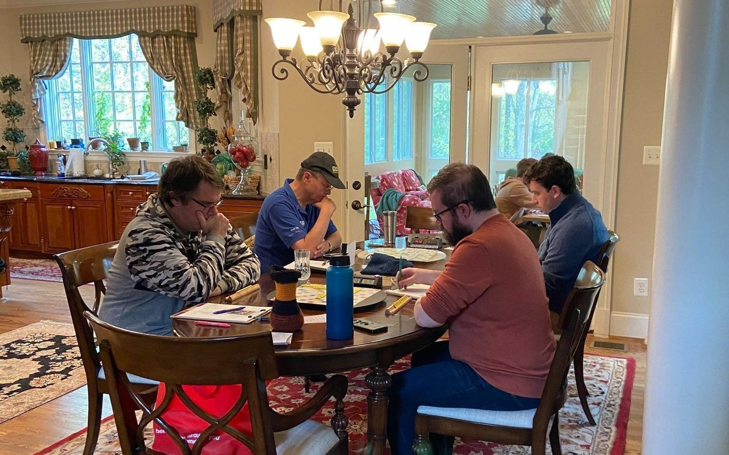 What do you do on the first beautifully crisp and sunny weekend of autumn? Well, if you're reading this, the answer is probably clear - you play Scrabble, of course! This weekend saw nine of us gather in picturesque Potomac, Maryland, to enjoy the first fall colors splashing the trees, random deer visiting the backyard, and some intense competition across the boards. In the end, it was Josh Castellano yet again cracking the code to claim victory over an accomplished field of strong players, finishing at 12-2 +585. Second place was won by Matthew O'Connor with a 10-4 +457, and I ultimately took third at 8-6 +473. As an indication of how competitive this field was, the lowest final spread of anyone at the tournament was only -266!
