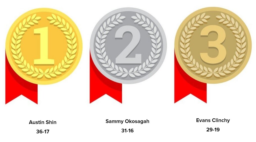 Our club champions for each quarter are decided by win-loss differential (wins minus losses), and headed into the final session, two familiar names were deadlocked at +14, well ahead of the field: Austin Shin (the spring 2021 champion) and Sammy Okosagah (the spring 2021 runner-up). To say these players' reputations precede them would be quite the understatement, and it was no surprise that they occupied the top spots again. But would Austin defend his title, or would Sammy unseat him and give us a new champion?