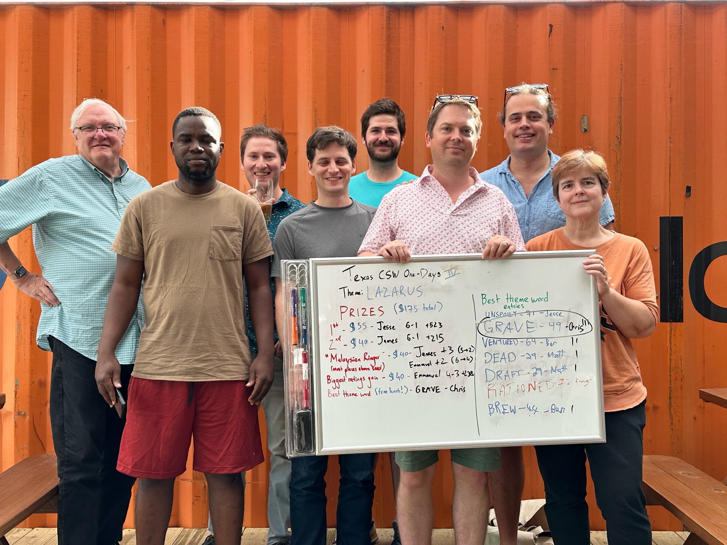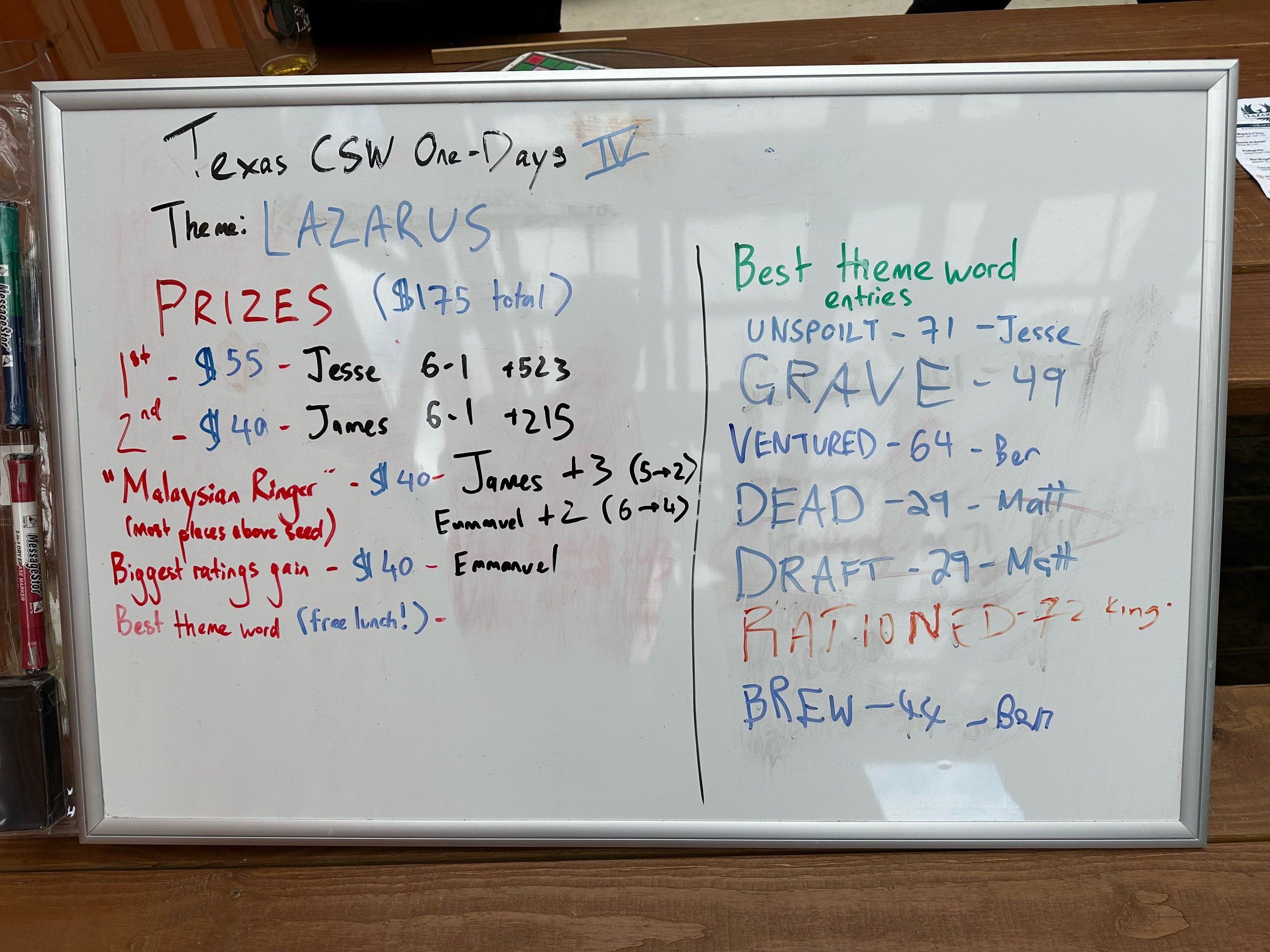 “It was the most Biblical Texas CSW One-Day yet. Due to an episode of pestilence, we took refuge at our neighborhood brewery, Lazarus Brewing, which nourished our 9 followers. The theme of the day was Lazarus, and Chris Canik won a free lunch by popular approval with his play of GRAVE. James Curley inexplicably rose from the dead to later clinch second place.”