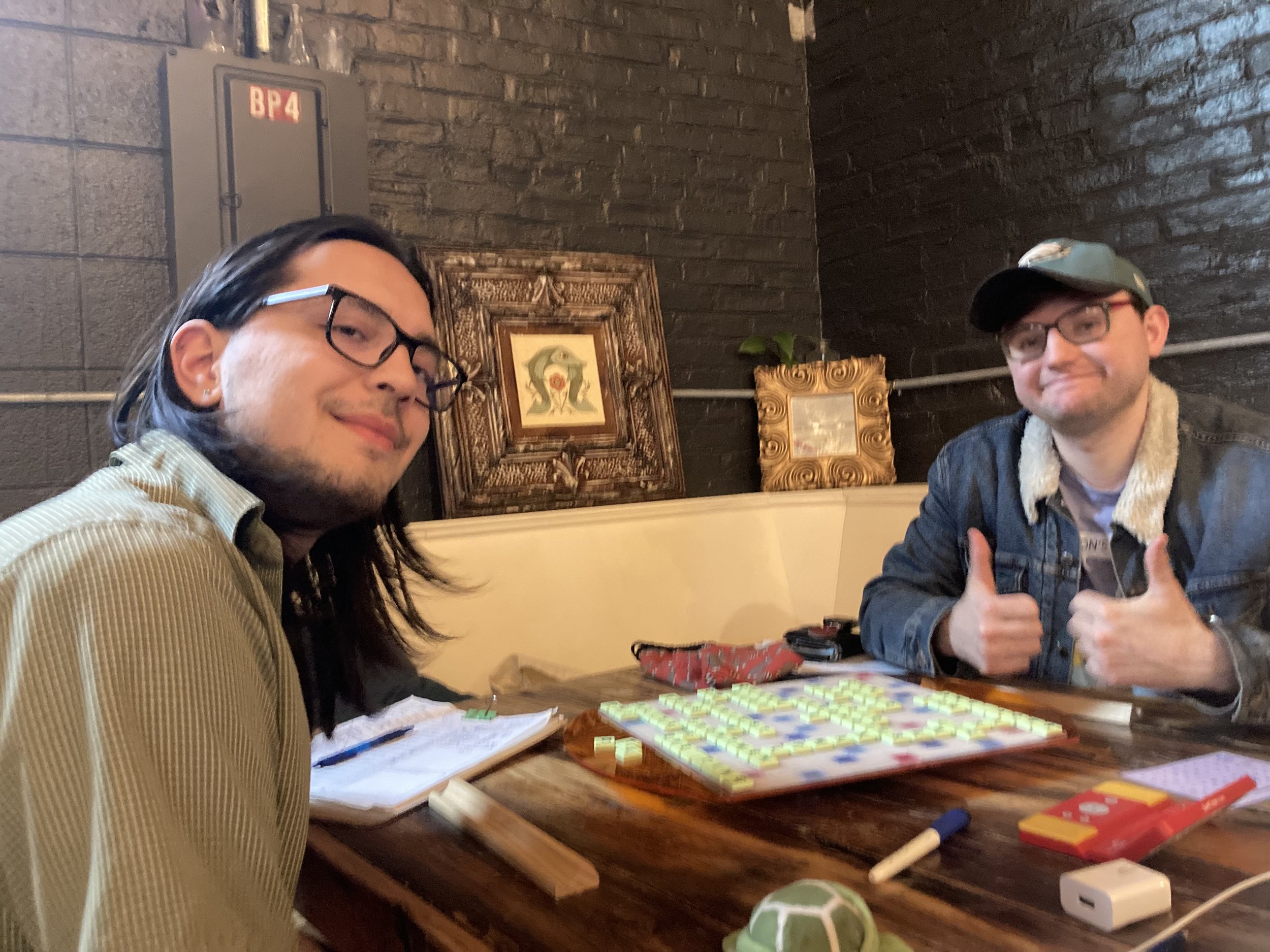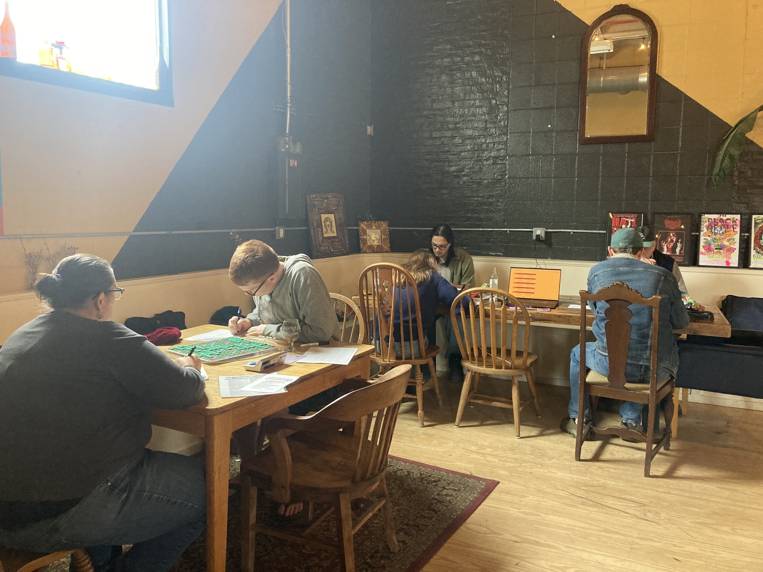 “Six Scrabblers joined us at a bustling local brewery for a day of tasty eats and tastier plays. The competition was fierce, with Matthew O'Connor sweating his way to first place after battling Chloe Fatsis in two tough games. Matt Zeleznik took second. Thanks to everyone who joined!”