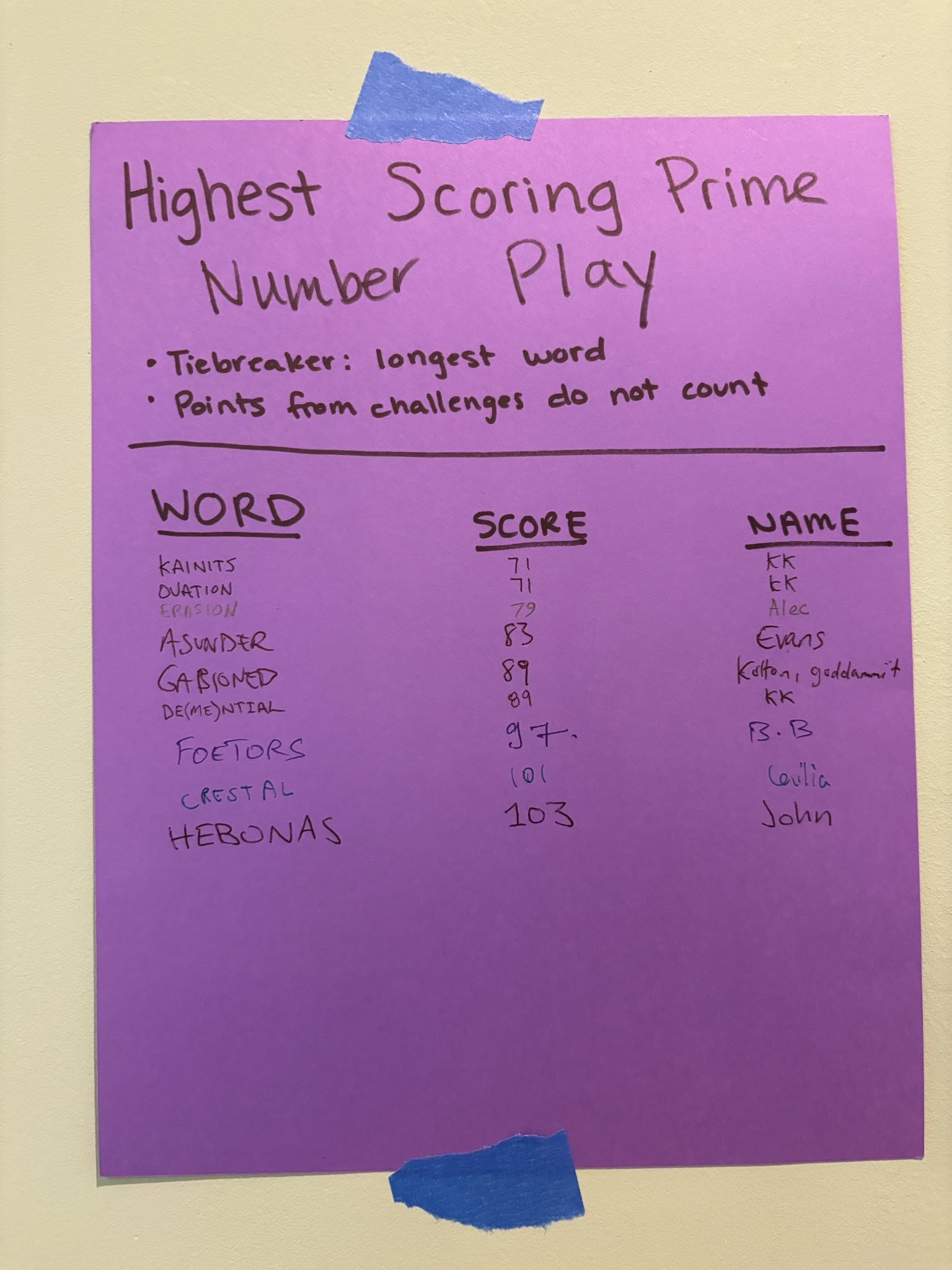 Fun prize: $1.03, John O'Laughlin (whose bingo of HEBONAS for 103 was the highest prime number score of the tournament)